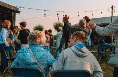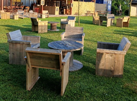 Wanneer we verder lopen naar de zomerbar, zien we het harde werk van Koen en de jongeren in realiteit. Mooi afgewerkte banken buiten en een gezellige zaal met bar binnen. Deze zaal verhuren ze soms voor kleinschalige evenementen zoals verjaardagen, zoals recent nog bij Charlotte, of communies, om zo ook opnieuw de buurt te betrekken. Maar het wordt vooral gebruikt voor eigen evenementen, zoals tijdens de zomer de zomerbar, ambachtelijk weekend, het festival Down To Rock en Holleke winter.