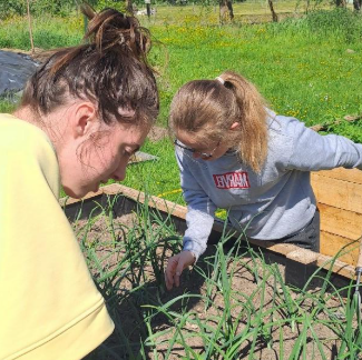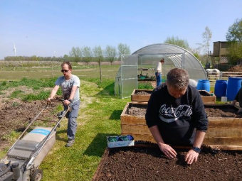 De moestuin werd eerst in volle grond aangelegd, maar ondertussen werken ze met ergonomische bakken, wat veel praktischer is. Hier groeien ajuinen, patatjes, pompoenen en andere groenten. Er is ook een serre.